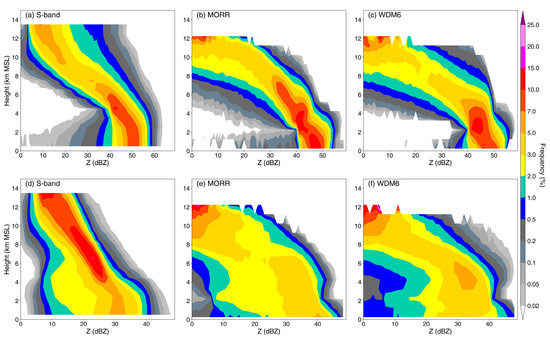 The CFADs of Z generated from S-POL radar observations and the MORR and WDM6 schemes for the convective and stratiform regions are shown in Figure 10. Close to the surface (i.e., below 3 km) in the convective region (Figure 10a–c), the maximum frequency contours of the MORR and WDM6 schemes (Figure 10b,c) tilt slightly to the right, with Z values increasing from ~42 dBZ at 3 km to 45–50 dBZ at the surface. Such a negative slope is not visible in the radar data (Figure 10a). Nevertheless, these simulated Z values (45–50 dBZ) near the surface are still slightly lower than the observed (50 dBZ). For the middle-upper levels (above 4 km) of the convective region, the observed and simulated Z values at the frequency maximum both decrease sharply with height. This fingerprint is associated with ice growth processes, suggesting precipitable particles increase in size by deposition, aggregation, or riming [24,70]. In the stratiform region (Figure 10d–f), the simulated Z exhibits a broader distribution throughout the altitude layer compared with observations, extending to around 45 dBZ (and >45 dBZ in WDM6) at a height of 6 km, with values between 30 and 45 dBZ occurring frequently below the freezing level, which is an overestimate of about 5 dBZ. Another distinct discrepancy between the model and radar stratiform Z CFADs occurs below 2 km, with a significantly negative slope in the frequency contours at reflectivity thresholds > 40 dBZ near the surface in simulations (Figure 10e,f).