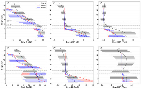 Comparison of (a,b) Z, (c,d) differential reflectivity (ZDR), and (e,f) specific differential phase (KDP) median profiles over (top) convective and (bottom) stratiform regions for S-POL radar and the MORR and WDM6 microphysics schemes in the sampling period 1200–1500 UTC. Error bars denote the interquartile range for each altitude layer. The gray dashed lines indicate the 0 °C, −10 °C, and −20 °C levels as recorded by soundings, with the lowest value at the bottom and the highest at the top.