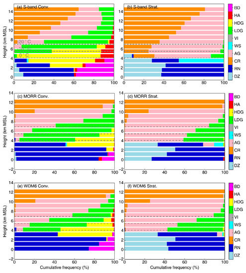 For the stratiform samples, ice crystals and aggregates each account for almost 50% of the hydrometeors above the freezing level in the S-POL radar observations (Figure 12b), whereas aggregates dominate in the MORR and WDM6 schemes (Figure 12d,f) except at the upper levels (above 11 km) where high fractions of ice crystals are observed. Additionally, simulations from both MORR and WDM6 tend to overestimate the graupel fractions at the mid-levels compared with the observed HID SFADs (Figure 12b,d,f; 36% and 43% vs. 7% on average) as also reflected in the biases in Z at these altitudes (Figure 11b). In stratiform regions, these rimed aggregates may be left over from collapsing convection [8]. In principle, there are three ways to induce a high bias in reflectivity if the particles are overly dense, numerous, or oversize. Due to their large size, a large fraction of snow aggregates would be expected to dominate the radar signal in this layer, but their fractions are similar among the three stratiform regions. It should be noted that the snow density assumed by the MORR and WDM6 schemes (and correspondingly in the forward simulator) is 100 kg/m3, which is much smaller than the assumed density of more rimed graupel (400 and 500 kg/m3). It appears likely that the overestimation of Z values in simulations is due to either the larger assumed graupel density or a larger graupel fraction. As expected, a rain layer of drizzle and moderate-sized drops (indicated by RN in Figure 12) is also observed in the stratiform region, as well as a melting layer largely composed of wet snow rather than graupel (Figure 12b). However, wet snow, an indicator of a melting layer [8], only accounts for around 10% in MORR and less than 5% in WDM6. Below the melting layer in the MORR simulation, an appreciable increase in moderate-sized drop fraction occurs at the lowest 2 km level, indicating enhancing warm rain growth processes in this layer, which may explain the distinct increases in the polarimetric radar variables at this altitude (Figure 11b,d,f).
