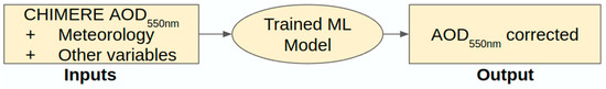 The principle of the AOD bias correction method relies on the use of the AOD and other atmospheric composition variables simulated by CHIMERE, in addition to certain meteorological fields. These constitute an input for a trained ML regression model. The latter derives a posteriori bias corrected AODs that are consistent with the AOD observations that were used for training the ML model beforehand, which are MODIS AODs. This inference, also called prediction in other contexts, is performed on a pixel-by-pixel basis for all ground pixels, i.e., no surrounding regional information is used for the AOD correction. A schematic description of this process is shown in Figure 1. We assume that the AOD is dependent on certain inputs, and we derive an approximate relationship that maps the inputs to the correct AOD using statistical modeling. This type of modeling is data-driven, meaning that it requires a large database of known solutions encompassing a broad range of possible scenarios.