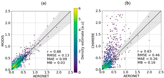 Scatter plot of 966 collocated data points comparing the AOD at 550 nm measured by 8 AERONET sun photometers for the year 2021 with (a) MODIS satellite observations and (b) simulated AODs by the CHIMERE chemistry transport model. The black line is the y = x line with the gray shaded areas representing the ± 20% interval of its slope.
