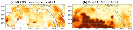 Satellite measurements, such as those derived from the Moderate Resolution Imaging Spectroradiometer (MODIS) spaceborne sensor [6], play a fundamental role in observing the spatial distribution of aerosols at the global scale. These remote sensing observations are mainly derived in terms of the AOD, which describes the total column extinction that is integrated over the whole atmosphere. They therefore provide maps of the horizontal distribution of aerosol abundance. However, they are only available for cloud-free conditions and are limited by the overpass time of the (polar orbiting) satellite. On the other hand, chemistry transport models (CTMs), such as CHIMERE [7], numerically simulate the hourly 3D evolution of aerosol plumes in the atmosphere, independent of the cloudiness. The accuracy of the CTM simulations depends on the precision of the inputs, e.g., the emissions of atmospheric constituents, wind, vertical velocity fields, and on the assumed aerosol properties (e.g., microphysical and optical properties). Due to assumptions and inaccuracies in these datasets, simulations of the aerosol spatial distribution are prone to bias compared to observations [8,9]. These errors are related to uncertainties in the physical parameterizations of the model, input data, and numerical approximations [10]. Modeling errors are more pronounced in regions lacking ground-based stations to validate and constrain the simulations, which is the case for the African continent and the Middle East.
