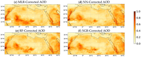 Evaluation of the daily consistency of the corrected AOD shows that the overestimation of peaks and the underestimation of background values at a given location (shown for Cairo) have been successfully improved, for both desert dust and anthropogenic aerosol loads. These results are consistent with analyses of the influence of the input features, showing that the RF model adequately uses different atmospheric constituents to deal with different situation (e.g., desert dust, anthropogenic pollution, and background concentrations). We also find that the ML-derived AODs may still underestimate very high AOD values compared to MODIS observations.