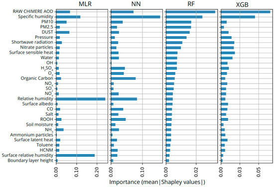 Figure 5 shows the horizontally averaged absolute contribution of each input variable for the four ML models in terms of Shapley values. It shows that a larger number of variables contribute relatively evenly to the prediction of the AOD values for the RF and XGB models than those of MLR and NN. For the latter, some variables, such as the abundance of ammonium particles and OH radicals, show almost zero importance. For all ML models, as expected, the raw CHIMERE AOD is important for the predictions, and in the case of RF, this is also true for other variables that also represent the abundance of aerosols, such as particle mass concentrations in terms of PM2.5, PM10, and total dust concentration. Another important variable for all the ML models is the specific humidity, especially for the MLR model, where three humidity-related variables share half of the total prediction importance. As noted in the following paragraph, the ML models appear to use humidity to numerically adjust the background values of AODs in different ways over either dry or humid regions. In the case of RF and XGB, moderate importance is also seen for meteorological variables (such as atmospheric pressure, shortwave radiation, sensible heat flux, and water droplet precipitation) and also for atmospheric species related to anthropogenic activities and chemically active species, such as nitrate, sulfate particles, and OH. The latter suggests a potential ability of the two ML models mentioned above to account for contrasting meteorological conditions on aerosol evolution (e.g., clear skies during high-pressure situations or the influence of low-pressure systems with increasing cloudiness) and the influence of anthropogenic emissions on particle abundances (the geographical influence of the latter is discussed in the following paragraphs).