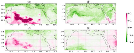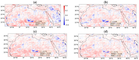 Median values of the difference between CHIMERE bias corrected AOD550 and MODIS AOD550 for the dates of DTest for the (a) MLR, (b) NN, (c) RF, and (d) XGB ML models.