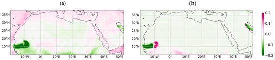 Another very interesting aspect is highlighted by the Shapley values for nitrate particles (Figure 6d). We notice that their most important influence is located over the Arabian Peninsula, collocated with the anthropogenic particle event prevailing over this region. Interestingly, we clearly see that the ML models (especially RF and XGB, Figure 4c–f) can adequately correct this negative bias of the raw simulation’s AOD, which is related to particles of a different origin (anthropogenic activity) as over North Africa, and appropriately use the nitrate particle concentration for its prediction.