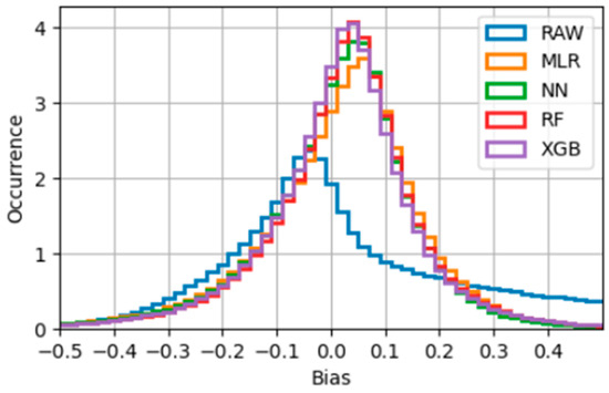 The AOD correction biases (with respect to MODIS observations) show frequency histograms that are bell-shaped and centered around a small positive value. This suggests a small overall positive overcorrection of the raw AOD (Figure 8). This is consistent with the positive values of the medians (50% percentile) and the negative skewness in Table 1. On the other hand, the mean bias values (μ) are close to or equal to zero, which is expected since the models are trained by minimizing the mean squared error.
