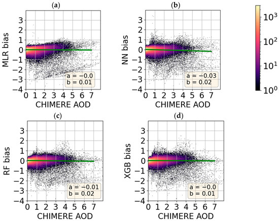 Scatterplots showing the AOD biases amplitudes corrected by the following ML models: (a) MLR, (b) NN, (c) RF, and (d) MLR, with respect to the a priori AODs (raw CHIMERE AOD550 estimates) for DTest. The green line represents the linear fit with a slope a and the intercept b. Colormap represents the occurrence.