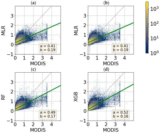 Scatterplots of corrected AOD550 inferred by the (a) MLR, (b) NN, (c) RF, and (d) MLR models, with respect to AOD measurements from MODIS for DTest. The green line represents the linear fit with a slope a and the intercept b. The gray lines represent the lines y = x. Colormap represents the occurrence. The apparent limit of the MODIS AOD at the value 3.5 is an arbitrary upper limit fixed by the original Deep Blue retrieval algorithm.