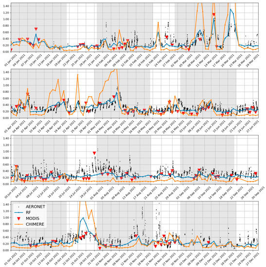 The AOD correction models are trained using MODIS AQUA satellite observations, which has an overpass time of (13:30 LT). It is necessary to ensure that the models are temporally stable and usable outside the AQUA overpass time. For this purpose, we correct the raw CHIMERE AOD outputs at 10:00 LT using the RF model, and then compare the inferred AODs to MODIS observations from the Terra satellite, which has a local overpass time of 10:30 LT. Thus, the daytime of the training database (13:30 LT) is different from that of the test (10:30 LT). We chose only the RF model to perform the upcoming analysis because the statistical performance of the other ML models is similar. The comparison shows that improvement in correlation and residuals is comparable to the corrected AODs at 13:00 LT. From Table 2, we can see that the residuals (RMSE, MAE, and MB) are improved. The RMSE is reduced by 0.68% and the correlation is increased to 0.68 (from 0.52 for the raw CHIMERE AODs). This good AOD correction for a morning hour implies the possibility of using the correction method for different simulation hours of the day. However, we remain conservative in using the AOD correction method during night hours as the ML model will more often have to extrapolate unseen situations, e.g., low boundary layer heights, low temperatures, etc.