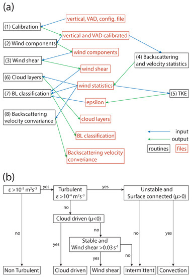 - Planetary Boundary Layer: The PBL classification is based on the statistics (output from step 4), turbulence (output from step 5), and wind shear (output from step 3) files at 3 min temporal resolution. The main output variables are PBL classification, turbulence coupling, and aerosol layer mask. The PBL classification consists in eight classes: No signal, Non-turbulent, Convective mixing, Wind shear, Intermittent, In cloud, Cloud-driven and Precipitation. According to [15], the classification scheme requires as input data the attenuated backscatter coefficient, vertical speed skewness, dissipation rate of TKE (), vertical profiles of horizontal wind, and vector wind shear (see also Figure 2). An attenuated backscatter coefficient () greater than 10−5 m sr−1 is associated with clouds resulting in the In Cloud category. For the other categories, is lower than than 10−5 m−1sr−1. Next, if is lower than 10−5 m2s−3 the flow is considered non-turbulent. For small values of (<10−4 m−1sr−1) and in the case in which skewness is negative starting just below the cloud, the PBL turbulent mixing source is Cloud-Driven. If the skewness is positive, unstable near the surface (daytime), and it is surface connected then the turbulence mixing source is Convective. If it is not surface connected then the turbulence mixing is categorised as Intermittent. When it is not unstable near the surface (nighttime) and the wind shear is greater than 0.03 s−1, the category is Wind Shear. Otherwise, the category is Intermittent. The turbulence can be Surface Connected, Cloud-driven or Unconnected. The range gates that are classified as turbulent but are unconnected to surface or clouds during daytime, and also are not related to wind shear during night-time, are labelled as Intermittent. In this case, the turbulence is assumed to arise from other intermittent sources [16]. The corresponding decision tree scheme to determine the PBL classification is shown in Figure 2b.
