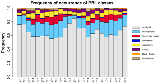 The monthly frequency of occurrence of every PBL class is shown in Figure 3. For each month, based on all available profiles, the frequency of occurrence of each PBL class for all range gates up to 3000 m altitude was extracted. For each profile, the first three range bins were not included in the analysis based on previous research [15,16,18] to eliminate non reliable range gates. The range gates categorised as No signal are those for which SNR (signal to noise ratio) is lower than 0.01 (1%) [17]. The range gates with SNR < 0.01 correspond to free troposphere where the aerosol load is usually low. The range gates with SNR > 0.01 were used to determine the PBL classification.