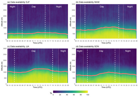 To filter the wind products, we used the PBL classification data based on Signal/No signal, seasonal data at 3 minutes temporal resolution for every range gate over the two-year study period. For each season and for each range gate, the percentage of PBL classes from the total number of available observations was calculated (Figure 4). A threshold valued of 60% was used to determine the maximum altitude of reliable signal and to select the range gates used for analysis. Also calculated were the mean (i.e., value on the middle of each season, for example, 15 January for DJF) sunrise start, sunrise end, sunset start, and the sunset end for each season with the main purpose of having an approximate delimitation of day and night variations (Figure 4). The diurnal cycle of the data availability shows a maximum at approximately 1200 m altitude during summer around 12 UTC (Figure 4c) and a minimum at approximately 400 m during winter around 00 UTC (Figure 4a).