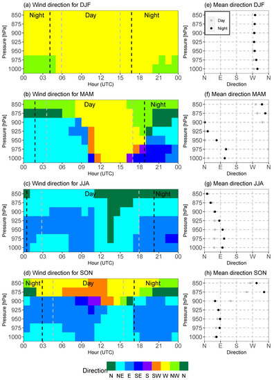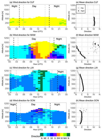 ERA5 hourly means of horizontal wind directions for December 2019–November 2021 analysed period for all seasons (a–b) and the mean direction profiles for daytime and nighttime (e–h).