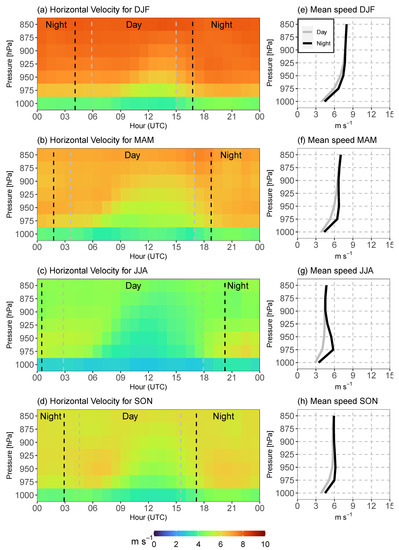 ERA5 hourly means of horizontal wind speeds for December 2019–November 2021 analysed period for all seasons (a–d) and the mean speed profiles for daytime and nighttime (e–h).
