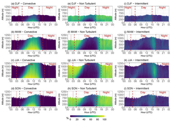 Frequency of occurrence for the three dominant PBL classes: Convective (a–d); Non Turbulent (e–h); and Intermittent (i–l) for each hour, range gate and season at Magurele station.