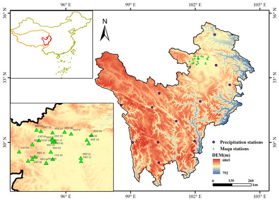 Overview map of the study area and distribution of Maqu observation stations and meteorological stations. The purple circles represent the distribution of precipitation stations, while the green triangles indicate the distribution of stations in the Maqu observation network that provide in situ measurements.