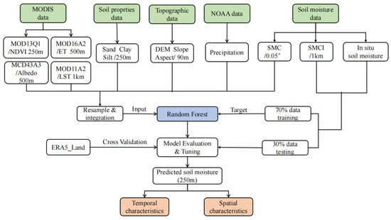 The flowchart in Figure 2 illustrates the process of using a random forest algorithm for soil moisture prediction in this study. The dataset used in this research consisted of 9606 samples, spanning from 2009 to 2018 during the nonfreezing period from May to October. To begin, various data sources were collected and processed, including MODIS surface variables (NDVI, LST, albedo, and ET), soil texture data, topographic and precipitation data, and in situ measurements and soil moisture products (SMCI and SMC). The in situ measurement data were used to extract the values of corresponding independent variables according to the latitude and longitude of the measurement site. The SMCI soil moisture product data were used to extract the mean value of each input feature variable within the SMCI pixel range (1 km × 1 km) from the corresponding input dataset. These values were integrated with the in situ measurement data as the training target value. The SMC soil moisture product and the remaining parameter variables were used as the feature values to create a sample set that matched the temporal and spatial scales. The sample set was then divided into 70% for training (from May to October in 2009–2015) and 30% for testing (from May to October in 2016–2018). The random forest algorithm was used to construct the complex correlation between the feature variables and target values. The input variables were then resampled to the same cell (250 m) and imported into the trained random forest model to generate high-precision soil moisture data. The results were spatio-temporally validated using measured data and ERA5_Land reanalysis products. Finally, the spatial and temporal variation characteristics of the final soil moisture data (250 m) were analyzed.