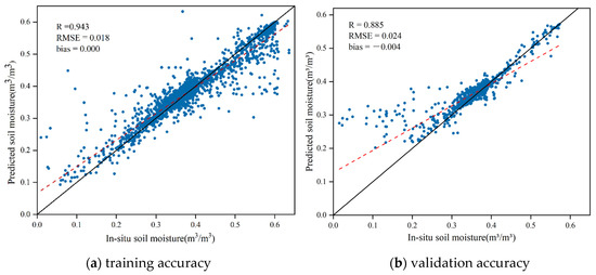 Scatterplot of the comparison between random forest predictions and in situ measurements: (a) Illustrates the model’s accuracy on the training set; (b) shows the model’s accuracy on the validation set.