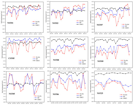 Due to the limitations of the in situ measurements, there were only nine sites with sufficient data for the current study period. We selected nine sites with sufficient in situ measurement data, namely NST01, NST03, NST05, NST06 NST07, NST08, NST09, NST25, and CST05, and compared the time-series changes of the in situ data, random forest (RF) prediction models, and SMCI soil moisture products. As shown in Figure 4, the study area is affected by terrain and climate factors, leading to significant fluctuations in ground measurement soil moisture. The RF prediction model performed well at the NST01, NST03, NST05, and NST09 stations, capturing changes in soil moisture data measured in the field more accurately. Furthermore, our model’s predicted values were found to be in closer agreement with field soil moisture than the SMCI soil moisture products. However, the overall performances of the remaining stations were unsatisfactory. Although the RF prediction value could capture the in situ data’s fluctuations, there were significant discrepancies in the values, especially in the high and low soil moisture range. This may be due to a bias in the training samples resulting from the lack of labels for a large range of high and low samples.