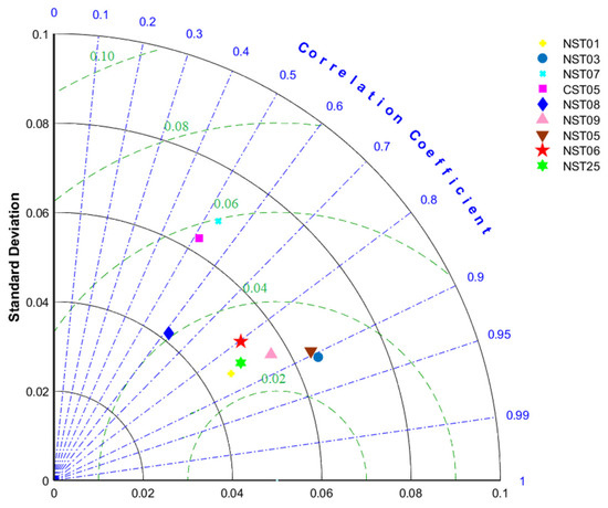 Taylor plots further show a comparison of the accuracy of in situ measurements and random forest predictions of soil moisture at nine relatively independent and complete measured sites (NST01, NST03, NST07, CST05, NST08, NST09, NST05, NST06, and NST25).