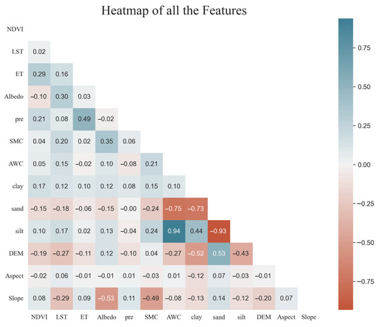 To evaluate the correlations between the independent variables in the RF model, we used the Pearson correlation coefficient. As illustrated in Figure 6, there is a strong negative correlation between the characteristics of soil texture such as sand and silt (−0.93), clay and sand (−0.73), with correlation coefficient values surpassing −0.7. In general, there is a high positive correlation between individual MODIS product data (NDVI, LST, ET, and albedo). There is a correlation coefficient of 0.3 between the land surface temperature (LST) and albedo. Additionally, the correlation coefficient between the normalized difference vegetation index (NDVI) and evapotranspiration (ET) is 0.29. It is worth noting that there exists a robust association between evapotranspiration (ET) and precipitation (pre), as indicated by a correlation coefficient of 0.49.