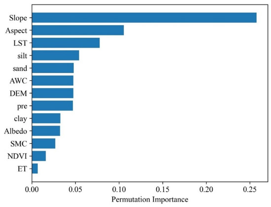 To further analyze the importance of different variables, we used the permutation importance method, as shown in Figure 7. The permutation importance method was used to determine the significance of different variables in the RF model by evaluating the decrease in model performance when individual feature values were randomly shuffled. This is a model-independent method that and can be repeatedly computed with different combinations of features on the hold-out test set [64]. The results show that fine-scale topographic data (slope and aspect) have the highest level of importance, followed by soil texture data (silt and sand) in the RF model. This suggests that fine-scale topographic and soil texture information are crucial in generating high-precision soil moisture data. In contrast, NDVI and ET data played a minimal role in the soil moisture retrieval process. Additionally, the importance of the SMC soil moisture product was also low, which may be attributed to its coarser spatial resolution. It is worth noting that LST ranked third and that we also considered the effect of surface temperature when selecting the nonfreezing period for our analysis.