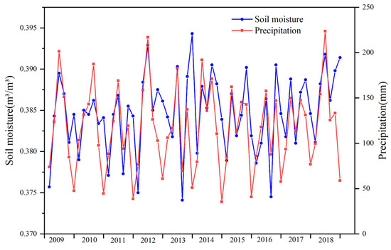 There is a strong association between rainfall and soil moisture [65]. The relationship between precipitation and soil moisture over the period from 2009 to 2018 in the study area was further examined by plotting their inter-annual variation. As illustrated in Figure 9, the soil moisture in the study area exhibited periodic fluctuations from year to year and had a strong correlation with precipitation. The soil moisture values fluctuated between 0.3741 m³/m³ and 0.3943 m³/m³, and the precipitation values fluctuated between 35 mm and 223 mm. Throughout the study period spanning from May to October, there was a discernible pattern in the precipitation levels, which initially showed an upward trend before gradually decreasing. The highest amounts of precipitation were recorded during the months of July and August. Concurrently, the soil moisture content also exhibited a similar trend, with its peak values occurring during the months of July and August.