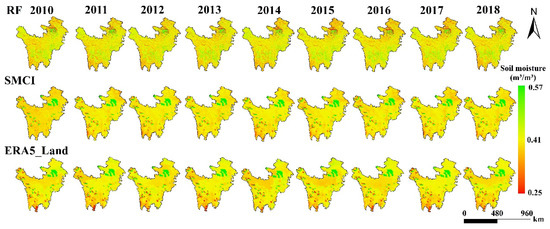 In this study, we present the spatial distribution of soil moisture from the Random Forest model compared with the SMCI and ERA5_Land soil moisture products in 2018 (Figure 8). The SMCI soil moisture product has a spatial resolution of 1 km, and the ERA5_Land soil moisture product has a spatial resolution of 0.1°. The results of the study found that these three products have similar spatial patterns of soil moisture. The soil moisture content within the study area exhibits significant variation, ranging from 0.15 m³/m³ to 0.66 m³/m³. High soil moisture values are mainly distributed in areas with dense vegetation coverage, such as river valleys, wetlands, and other low-lying areas. The coarse-resolution soil moisture products have many noise points in the extreme soil moisture regions, while the Random Forest model product has better spatial continuity. The prediction outputs of the RF model are generally smoother, more stable, less noisy, and reflect more detailed regional soil moisture information since random forest has a good tolerance to outliers and noise. Although there is an overestimation in some regions, the results provide a more detailed and fine-resolution spatial distribution of soil moisture compared to the coarser resolution products.