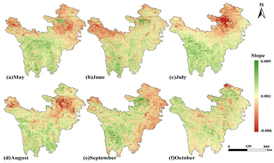 The overall trend of soil moisture change in the study area during the nonfreezing period from 2009 to 2018, as determined through linear trend analysis, was a gradual increase, with variations seen in different months. As shown in Figure 12, the rate of change was small, with values fluctuating between −0.006 and 0.009, and the differences were not significant. On the one hand, in May and June, the southwestern region showed a gradual increase in soil moisture, with area ratios of 77.46% and 70.34%, respectively. On the other hand, the northwest and northeast regions showed a decrease in soil moisture. In July and August, the increase in soil moisture was mainly concentrated in the southwestern region, and in September there was a significant increase in soil moisture, with an area of 82.45% increase, except for the low-altitude edge areas. The overall change in soil moisture in October was relatively small.