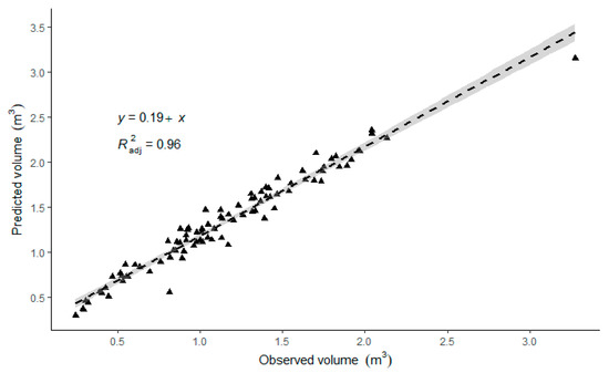 Relationship between the volumes (m3) estimated with the parameterized Riemer´s equation and field measurements of Pinus radiata stands in Ñuble Region (South, Chile). The linear model of this relationship (dashed line), the coefficient of determination, and the fitted model equation are shown. The gray shading around the line represents the 95% confidence interval.