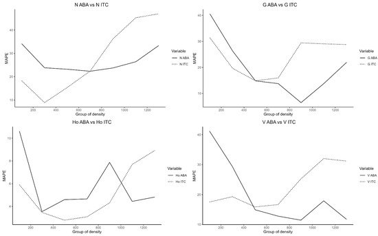 Distribution of the mean of the absolute value of the residuals (MAPE,%) in the estimation of the forest inventory attributes of Pinus radiata stands in Ñuble Region (South, Chile) using the Area-Based Approach (ABA) and Individual Tree Crown (ITC) models (see Table 2, n = 48 plots) as a function of plot density in intervals of 200 trees ha−1. Density (N, trees ha−1), Assman´s dominant height (Ho, m), Basal area (G, m2 ha−1), Volume (V, m3 ha−1).