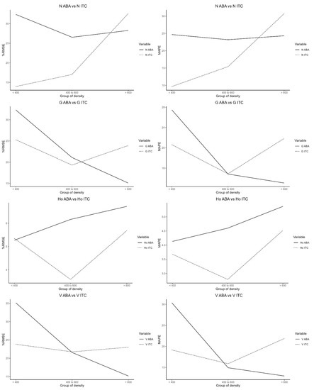 Figure 5 shows the RMSE and MAPE values obtained after estimating each forest attribute for each density interval. These errors were calculated by taking the residuals of the plots corresponding to each density interval (Table 4). Similar trends for G and V could be observed, with better results for ITC at low densities, similar results at medium densities, and better results for ABA at high densities. The tree density showed better results for ITC at medium and low densities, and better results for ABA at high densities. In the case of Ho, the results were similar at low densities, improving the ITC results for medium and high densities.