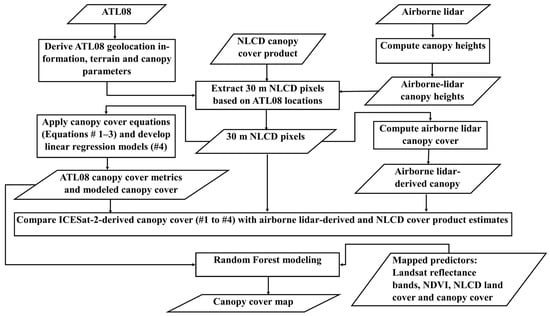 Workflow for mapping canopy cover with ICESat-2. Slanted boxes represent data, straight boxes indicate actions, and arrows denote sequence or flow between data and actions.
