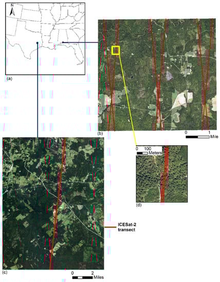 (a) Location of study sites within the Southern US, (b) ICESat-2 tracks (only strong beams) over the Solon Dixon Forestry Education Center in southern Alabama, (c) ICESat-2 tracks over the Sam Houston National Forest (SHNF) site in south-east Texas, and (d) Visual representation of a sample of ATL08 segments over SDFEC. Data are overlaid on 1 m National Agriculture Imagery Program (NAIP) imagery.