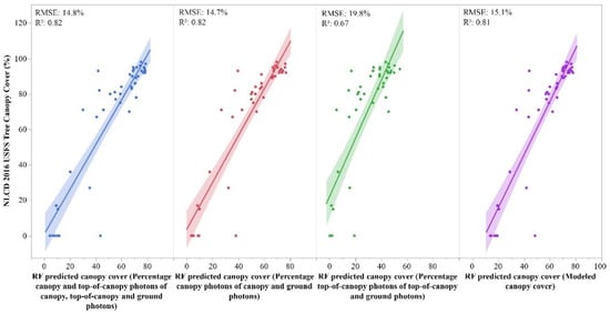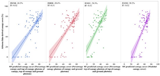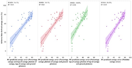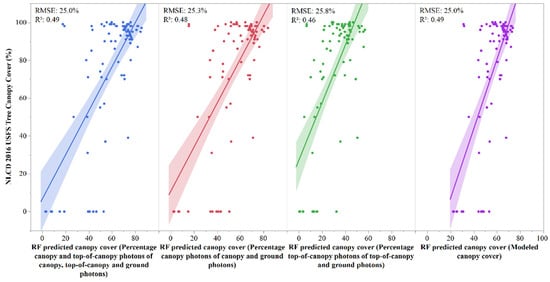 An examination of the relationships between the RF-predicted canopy cover and spatially coincident NLCD tree canopy estimates (mean = 69%) over the SHNF site produced R2 values between 0.67 and 0.82 (Figure 4) and RMSEs between 14% and 20%. Just as before, except for ICESat-2-predicted canopy cover based on Equation (3) (R2 = 0.67), results were very similar (R2 = 0.81–0.82), and RF-predicted canopy cover using the ICESat-2 estimates from Equation (2) produced the best results with an R2 and RMSE of 0.82 and 14.7%.