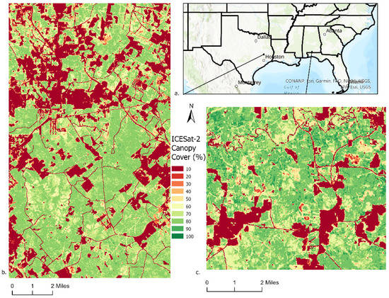 ICESat-2 canopy cover maps for two Southern US sites (a); SHNF (b) and SDFEC (c).