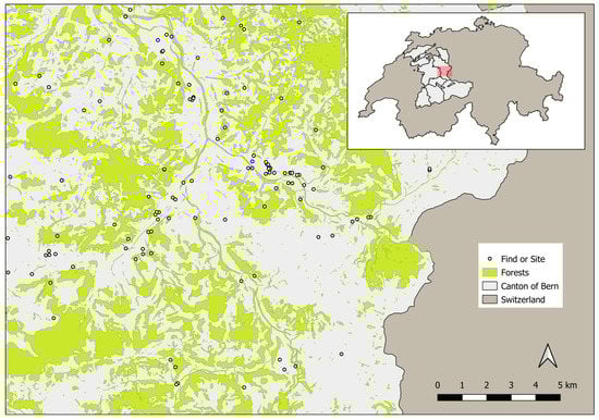 - Glanzmann, J. Auf Spurensuche im digitalen Geländemodell: Archäologische Funde im Wald dank Laservermessung aus der Luft. NIKE-Bulletin 2021, 36, 20–23. [Google Scholar]