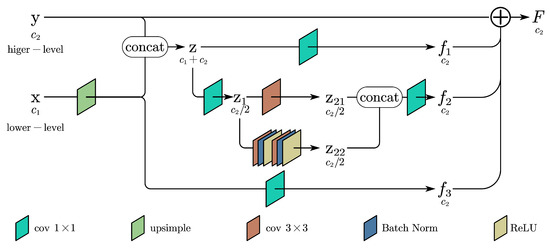 where y is the higher level, i.e., representing the feature from a higher level. is obtained from the lower-level input x after upsampling, and the number of channels is transformed by the convolutional layer, representing the feature from the lower level.