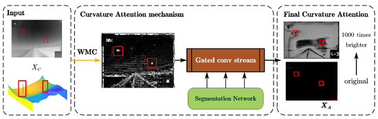 The image in the final curvature attention is shown in the right of Figure 3. Since the original image only acts in the model, its grayscale value is too low to be observed by humans. To better observe the effect of the curvature attention mechanism on the initial curvature image, we zoomed in on the elements of the original image 1000 times. In this case, except for the higher grayscale values around the two target locations, all areas remained at lower grayscale values even after the number of runs increased by 1000. It can be seen that, by performing gated convolution, the model can restrict the attention to the vicinity of the targets. After obtaining the curvature attention , it will be combined with the output of the semantic segmentation network . First, we activated the two matrices with the sigmoid function to make the prediction more obvious.