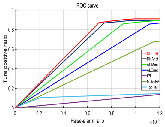 As shown in Figure 4, we plotted the ROC curves of different methods on NUAA-SIRST. It can be seen that our model performed better than the other methods. Additionally, the area under the ROC curve (AUC) of the proposed CHFNet was also significantly better than that of the other methods. For example, the AUC of CHFNet reached 0.9544, while the AUC of DNANet was 0.9461.