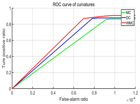 As shown in Figure 6, we compared the ROC curves of different curvatures including WMC, MC, and DC on the NUAA-SIRST database. It can be seen that the AUC of WMC was significantly better than the other forms of curvature. Thus, we can prove that there was performance superiority in using WMC in the proposed CHFNet.
