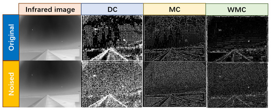 Furthermore, the image in the last column was obtained by increasing the mean value of the infrared image in the first column to Gaussian white noise, and the comparison between the noise image and the original image is shown in Figure 8. The mean value of the noise was , and the variance was . The curvature minimum value was 21.2500. It can be seen that all the curvatures were more sensitive to Gaussian noise, but the weighted mean curvature still maintained a relatively stable extraction effect.