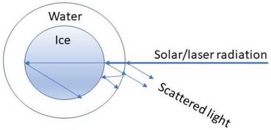 As in Sun et al. [23], we assume clouds that contain partially melting droplets. These droplets are either pure liquid water spheres or liquid water spheres with spherical ice cores, as illustrated in Figure 1. Also illustrated in Figure 1 is the complication of the light scattering process due to the inhomogeneity of the particle: Layered particles can involve more scattering or absorption of light.