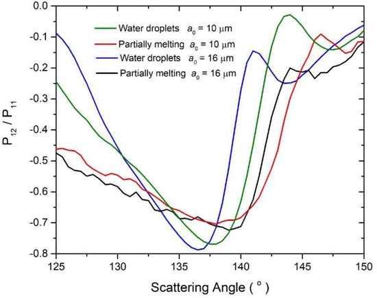 Figure 2 shows the linear polarization degree (P12/P11) of the scattered light from water clouds calculated with the layered sphere light scattering model at a wavelength of 865 nm. At this wavelength, the refractive index of ice is 1.30378 + 2.400 × 10−7, and the refractive index of water is 1.32437 + 3.546 × 10−7. We assume a0 = 10, and 16 µm, respectively, for two exemplary clouds. The clouds are either pure liquid water droplets or those with ice cores, as described previously. We can see that, when the clouds are dominated by large particles such as those with a0 = 16 µm, the existence of partially melting droplets changes the cloudbow angle significantly, and this could cause the polarimetric method to underestimate the particle size up to ~12 µm. However, for moderate-sized particles such as those with a0 = 10 µm, the polarimetric method should be able to retrieve accurate particle sizes no matter if the clouds consist of partially melting droplets or not.