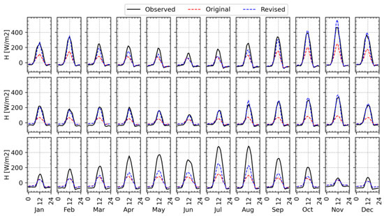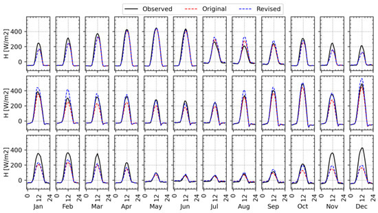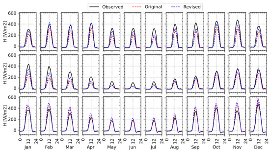 Figure 13 shows the time-averaged diurnal variations in the modeled versus the observed sensible heat fluxes across the grassland sites. Unlike in the forest sites (DBF, EBF, and ENF), no major differences are observed between the sensible heat fluxes simulated by the two parameterizations at grassland sites. The sensible heat flux simulated by the two parameterizations matches the observed sensible heat flux at the three sites relatively well compared to the forest sites. The revised parameterization slightly overestimates sensible heat flux during some months (January, February, and August) at the AU-Emr site. On the other hand, the original parametrization shows a slight underestimation of the observed sensible heat flux at the AU-Emr, specifically in March, April, May, and November. Both parameterizations underestimate the observed sensible heat flux from November to March at the AU-Rig site, albeit with a marginally less underestimation with the revised parameterization.