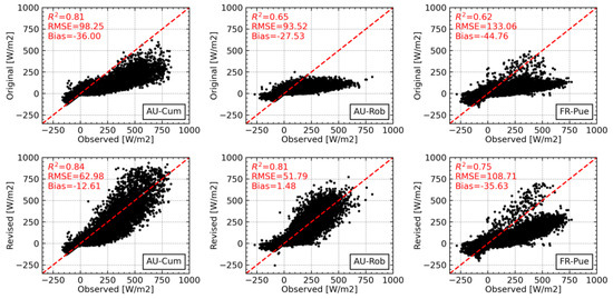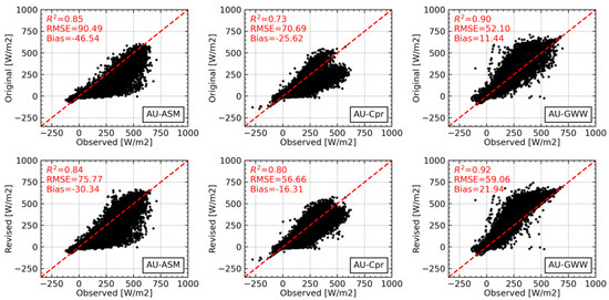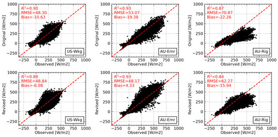 The variations in sensible heat flux observed in Figure 7 are also supported by the statistical results shown in Figure 8. The revised parameterization outperforms the original parameterization based on all three statistical metrics considered for all three EBF sites. In particular, a significant improvement is observed with regard to the RMSE and bias at the AU-Cum and AU-Rob sites.