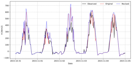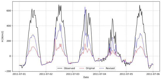 Variations in the observed and simulated sensible heat flux by the original and the revised parameterization at 30 min temporal resolution over five days at the AU-Emr site.