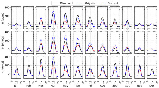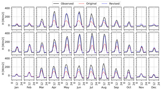 The time-averaged diurnal variations of sensible heat flux at savannah sites, shown in Figure 1, indicate that both the original and revised parameterizations consistently underestimate the observed sensible heat flux for most of the months at both the AU-ASM and AU-Cpr sites. At the AU-GWW site, however, the original parameterization matches the observed sensible heat flux better than the revised parameterization, while both parameterizations overestimate the observed sensible heat flux.