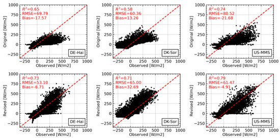 Relationship between the observed and simulated sensible heat flux by the original and the revised parameterization at Evergreen Needle leaf Forest (ENF) sites.